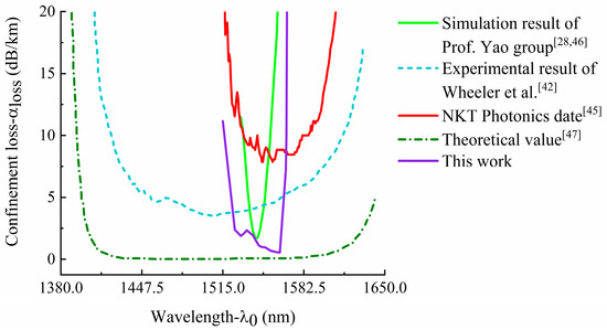 In order to verify the validity of the simulation model of HC-PCF, we have compared and analyzed the experimental results for the confinement loss characteristics of HC19-1550 from the relevant articles. The experimental results of the relevant articles show that the minimum confinement loss of HC19-1550 can reach 3.5 dB/km near the central wavelength of 1550 nm [42], and the minimum confinement loss of HC-1550-02 can reach 9.5 dB/km [43,44], which is consistent with the simulation results. As shown in Figure 5, we referred to the product manual given by NKT Photonics [45], and referred to the theoretical calculation value and experimental results of the relevant articles. It can be seen that the simulation result of the confinement loss in this paper has a similar trend with the experimental ones, and the order of magnitude of the confinement loss value is the same [46,47], which verifies the validity of the simulation model of HC-PCF in this research.
