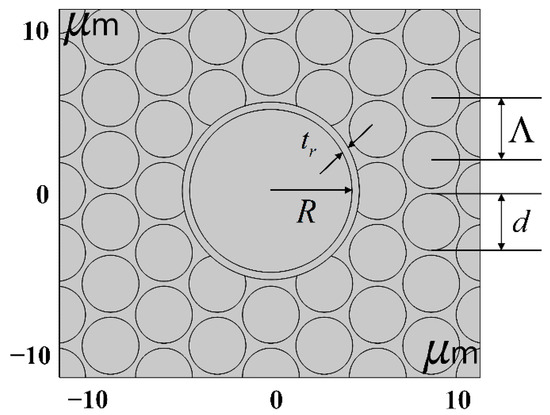 In this paper, the effects of the core radius and the core quartz-ring thickness on the performance of HC-PCFs were analyzed by selecting the wavelength λ = 1550 nm as a reference, where λ = 1550 nm is regarded as a spectral window for optical fibers to achieve ultra-long-distance transmission. The basic structural schematic diagram of HC-PCF with band gap cladding structure is shown in Figure 6. The variable parameters were as follows: Λ was 3.8 μm, d was 3.5 μm, R was 5 μm, t was 0.45 μm, and T was 1.5. Since R refers to the radius from the core to the inner quartz-ring wall, changing the core quartz-ring thickness will not affect the value of R.