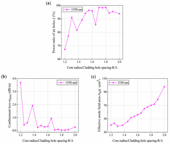 Figure 7c shows the relationship between the effective mode field area Aeff and R/Λ. It can be seen that, except for a fluctuation phenomenon at R/Λ = 1.25, the overall variation trend was a gradual increase with increased R/Λ, and the upward trend significantly accelerated after R/Λ = 1.85. As also demonstrated by Figure 7a, the reason for this acceleration is that the photon energy is located at the edge of the band gap.