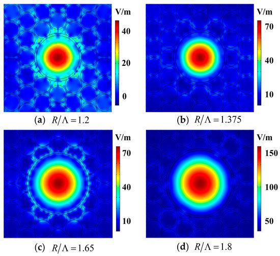 The mode field distribution diagrams of HC-PCF when (a) R/Λ = 1.2, (b) R/Λ = 1.375, (c) R/Λ = 1.65, and (d) R/Λ = 1.8.