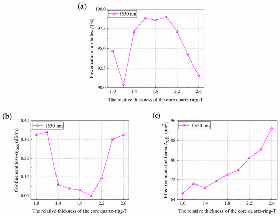 From the relationship between the confinement loss αloss and the relative thickness of the core quartz-ring T, as shown in Figure 9b, it can be seen that the overall variation trend of αloss was that it first decreased and then increased with the increase of T. When T changed from 1.4 to 2.2, αloss was below 0.10 dB/m, and αloss reached the lowest value of 7.31 × 10−5 dB/m at T = 2.0. Combined with the results from Figure 9a, it can be concluded that the lowest transmission loss band in the optical fiber had a higher f.