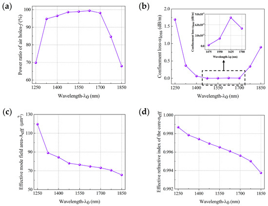 The response of (a) core optical power, (b) confinement loss, (c) effective mode field area, and (d) effective RI of the optimized HC-PCF to changes in wavelength.