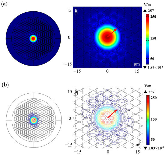 The optimized HC-PCF (a) mode field distribution diagram and (b) optical intensity contour distribution diagram at a wavelength of 1550 nm.