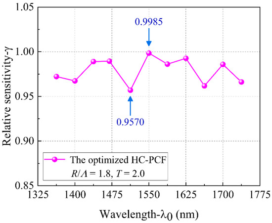 As can be seen from the simulation results in Figure 10 that the f value of HC-PCFs with band gap cladding structure has been greatly increased. The higher the f value, the higher the γ value, and the higher the sensitivity of the designed sensor. Figure 12 shows that the relative sensitivity of the optimized HC-PCF in the range of the low confinement loss bandwidth. Numerical results show that the relative sensitivity of the optimized HC-PCF in the range of the low confinement loss bandwidth is above 0.9570, and the highest relative sensitivity is 0.9985 can be obtained at 1550 nm. Compared with the ordinary circular central air hole structure with γ = 0.9435 at 1550 nm, the relative sensitivity of the optimized HC-PCF is further improved and is closer to the theoretical limit.