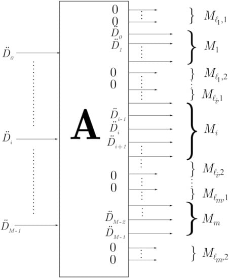 Let us consider the vector that represents M digitally modulated symbols. After the modulation, the phase of each sub-carrier is shifted with respect to that of the other sub-carriers, with the aim of reducing the PAPR. The phase of the output signal, in radians, is obtained by multiplying the phase angle of the input signal by a factor of . This block is represented in Figure 1 by , this matrix being defined as