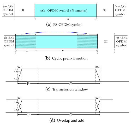 This process consists of overlapping and adding samples of the nth symbol with the samples of the previous one, as depicted in Figure 3d. The main goal of this operation is to shorten the extra time domain overhead resulting from the CP insertion. This block will be formulated next, jointly with the channel convolution.