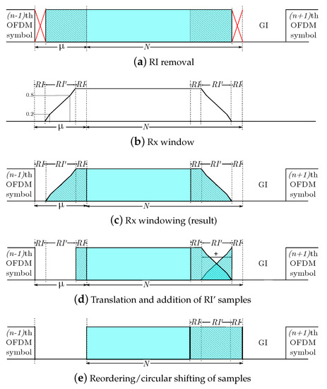 The first samples, which correspond with the overlapped part of the symbol, are directly taken out (see Figure 4a), since these samples are not required to reconstruct the original symbol. This process can be formulated as