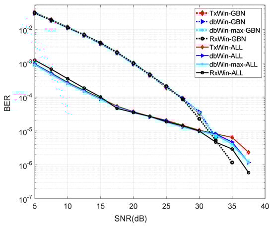 The BER performance for the four schemes analysed has been evaluated using the above matrices, which are on the basis of a PHY 1901 OFDM transceiver like that depicted at Figure 1. The systems have been programmed in Matlab on the basis of the Monte Carlo method, with a loop of 1 × 103 iterations. The BER obtained for the four different schemes are shown in Figure 5. As can be seen, there are practically no differences in the results for the different window schemes within each noise scenario (GBN, ALL). In addition, for almost the low SNR values, the sum of all PLC noises is a better scenario in terms of BER, than that in which GBN is present. There is a crossing point around 30 dB SNR that reflects a change in performance.