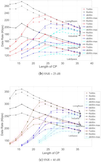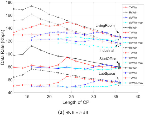Figure 8 depicts the achievable data rate obtained for the four IEEE 1901.2 schemes, considering the parameters of Table 6, different kinds of noise, and values of the SNR (5 dB, 25 dB and 40 dB). In all scenarios, the ranking of best achievable data rate performance is, in this order, the following: LivingRoom, Industrial, StudyOffice and LabSpace. Moreover, for each type of PLC noise, the best result is, for low lengths of CP (below 20 samples), for the scheme of windowing at reception (RxWin). The worst results are for the schemes of double windowing (dbWin and dbWin-max). For higher CP length values, a convergence of the obtained results is observed for each scheme.