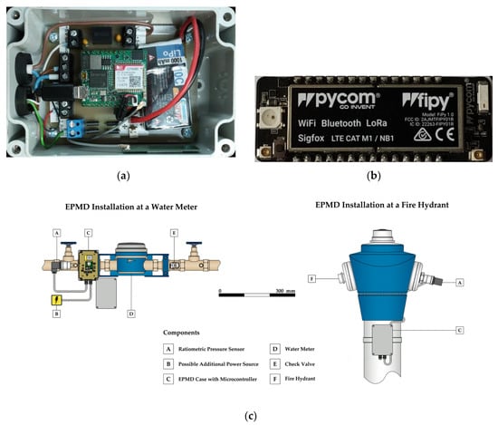 A microcontroller (MCU) with SIMCom SIM800C (general packet radio service, GPRS) communication module (a), MCU with Sequans Monarch (NB-IoT) and Semtech SX1272 (long-range wide area network, LoRaWAN and Sigfox) communication modules (b); schematic representations of energy-efficient pressure-monitoring device (EPMD) prototype installation at a water meter and at a fire hydrant (c).