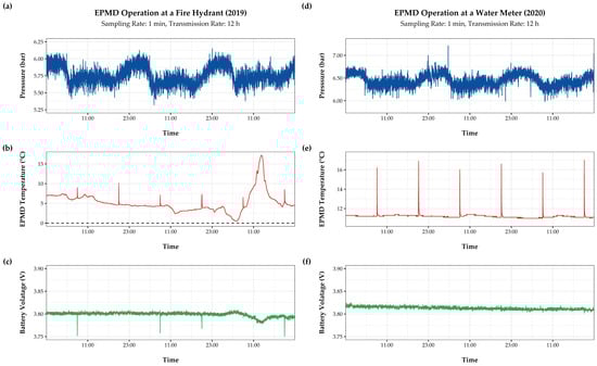 The pressure sensors [] of the EPMD, which use a linear voltage-signal-conversion to monitor pressure at a fixed input current, have an IP65-rating and all wetted surfaces are made from stainless steel, thus suitable for contact with drinking water. The devices are designed in a way that enables the use of an external antenna, if required. All cable glands are water and dustproof. Field tests showed that the devices can withstand temperatures below 0 °C, as well as above 30 °C, heavy rain, snow and even temporary submersion. Figure 2a–c shows a period of EPMD operation at a fire hydrant by the end of fall of 2019, where the device was exposed to all these weather changes and periods of direct insolation, with temperatures ranging between −5 °C and 25 °C. In comparison, in Figure 2d–f, an EPMD is operated at a water meter under more stable conditions in a basement of the same area in 2020. Pikes in temperature time series indicate data transmission.