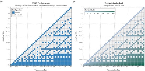 Among the potentially suitable configurations, those for which the transmission rate exceeds the sampling rate or those with a non-integral ratio of sampling and transmission rate were not considered. Derived feasible configurations are marked by blue tiles in Figure 4a, while the corresponding payload size per transmission, based on the above-mentioned encoding, is represented in the tiles in Figure 4b.