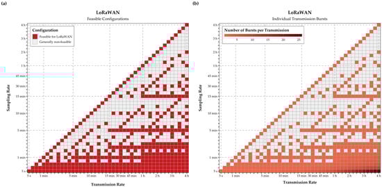 These transmission rates were not only applied to calculate energy consumption for data transmission, but to verify whether a configuration violates policy or contractual limits of LoRaWAN or Sigfox. For LoRaWAN, specifications and limitations for a frequency of 868 MHz were assumed, as is standard in Austria [], with a spreading factor SF 7 and a bandwidth of 250 kHz, leading to a maximum package size of 243 bytes and maximum application payload of 222 bytes. Consequently, configurations with high sampling and low transmission rates exceed this payload limitation for a single transmission. In these instances, a transmission was split into subsets of so-called bursts, a set of sub-transmissions with the maximum payload, minimizing overall device airtime. Figure 5b contains the number of bursts comprised by a single transmission.