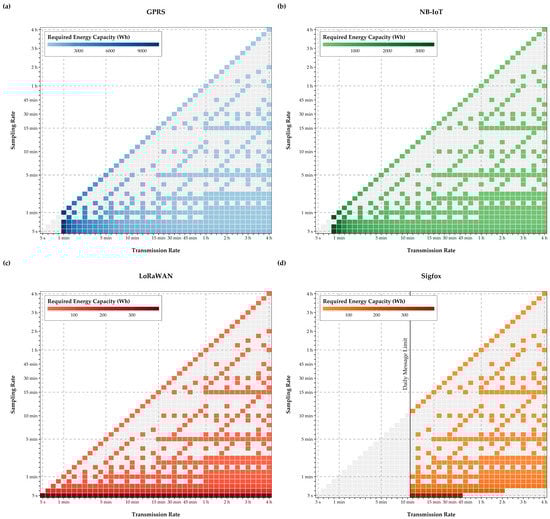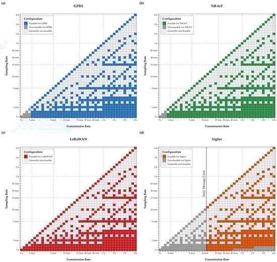 Given these assumptions and limitations, the final subset of feasible configurations was determined individually for GPRS, NB-IoT, LoRaWAN and Sigfox, represented by the tile colors in Figure 6. With the approach for splitting large transmissions into individual bursts, all device configurations can be analyzed for LoRaWAN. In contrast, the maximum of 140 daily transmissions and payload restrictions reduce the feasible configurations for Sigfox significantly.