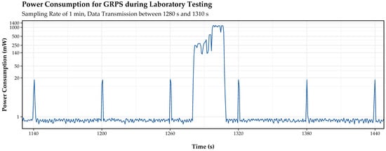 Figure 7 shows a power-consumption time series for GPRS as monitored with the EPMD in the laboratory. The time series depicts the power draw during deep sleep, interrupted with a peak every minute, indicating sensor operation and data logging on the internal storage of the device. The plateau occurring between seconds 1280 and 1310 is caused by data transmission. Power supply of the EPMD’s components is controlled by self-developed circuitry, regulating the voltage required by the sensor and the MCU when supplied from a battery. Energy losses arising from this circuitry were considered in the following analysis and results.