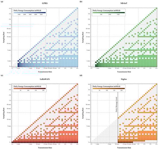 For Sigfox, radio configuration RC1 and contractual limits were assumed, as offered by Austrian Sigfox operator Heliot [], meaning a maximum payload size of 12 byte and a maximum number of 140 daily messages (see Figure 6d). For GPRS, transmission rates below one minute were not considered, as they would require permanent or quasi-continuous operation of the communication module in transmission state, thus violating the constraints of the energy consumption model and defying the purpose of low-power monitoring. For the same reason, transmission intervals under 45 s were disregarded for NB-IoT. Limitations on data transmission for NB-IoT at a frequency of 200 kHz can be contractual and specific to cellular network carriers. Nonetheless, the maximum payload size for a single NB-IoT transmission is limited to 1600 bytes [], a constraint, which was considered by splitting respective transmissions into multiple subsequent bursts, similar to the approach for LoRaWAN.