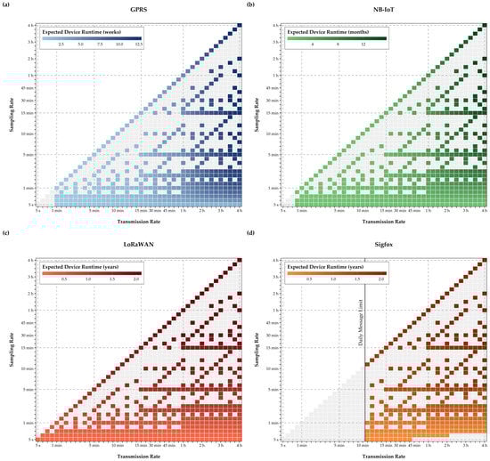 Results in Figure 9 show that device runtime can be significantly improved when swapping GPRS for LPWAN communication. While the small battery limits EPMD runtimes with the GPRS-module to around three months under ideal on-site operating conditions, which, as filed tests showed, can be diminished to several weeks, without a battery change or an external power source, all other technologies offer runtimes exceeding one year. Nonetheless, runtimes of two years can only be achieved with sampling rates exceeding 15 minutes and data transmission rates over one hour for LoRaWAN and Sigfox. In comparison, with NB-IoT, even when reduction sampling and transmission rates, devices can barely exceed runtimes of one year with the currently used battery. Interestingly, the horizontal color gradients in Figure 9 show the influence of transmission energy consumption for GPRS and NB-IoT, where longer runtimes require a transmission rate beyond one hour. In contrast, the vertical color gradient for LoRaWAN and Sigfox indicates that power consumption for monitoring and data logging on the MCU drives overall energy consumption.