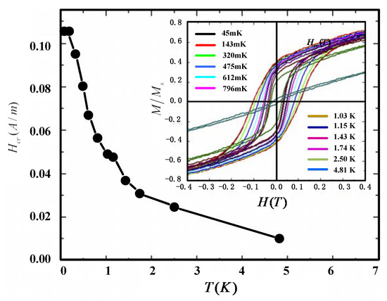 QFA consists of the permanent magnet, quartz, ER, iron, and polyester, whose temperature characteristics vary greatly [15]. A mass of research has analyzed the temperature hysteretic behavior of the magnet, which has been proved as the main factor affecting the scale factor performance. Taking a [Ru2(O2CMe)4]3[Fe(CN)6] permanent magnet as an example, the temperature hysteresis at different temperatures from 40 mK to 4.8 K is shown in Figure 1 [16]. Almost every temperature-dependence permanent magnet, like Alnico and Nd2Fe14B, is temperature-dependence hysteretic and the shape of the hysteretic curve is similar to the inset of Figure 1 [17]. The Alnico permanent magnet which is used in QFA has the similar hysteresis properties as [Ru2(O2CMe)4]3[Fe(CN)6] in the temperature cycle from −195 °C to 400 °C [18,19].