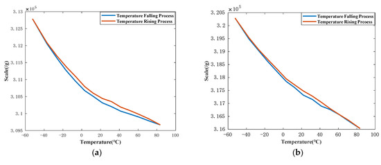 Based on Equation (13), scale factors at different temperatures can be calculated. Curves of scale factors vs. temperature are shown in Figure 5. In these figures, the upper curves represent the temperature-falling process, and the lower curve represents the temperature-rising process. Temperature sensors (DS18B20, Maxim Integrated, San Jose, CA, USA) were installed on the surface of QFA. Therefore, the readout of the DS18B20 was not exactly the same as it controlled by the temperature oven. The vertical axes of these three figures are numbers of pulse per gravitational acceleration. The results show that the scale factor of QFA is severely affected by the temperature. The scale factor decreases while temperature rising and the scale factor increases while temperature falling. The scale factor of JB-KT8 #1 changes about 10,010 ppm from about −54 °C to 81 °C and the temperature sensitivity of scale factor is 74 ppm/°C. The scale factor of JB-KT8 #2 changes about 13,600 ppm from about −52 °C to 82 °C and the temperature sensitivity of scale factor is 104 ppm/°C. The scale factor of JB-KT8 #3 changes about 14,200 ppm from about −53 °C to 82 °C, and the temperature sensitivity of scale factor is 105 ppm/°C. (ppm means part per million which is usually used to describe the degree of change. For example, scale factor changes from X to Y, the average of scale factor is A, and the variation of temperature is The change of scale factor normally defines as ppm. The temperature sensitivity of scale factor normally defines as ppm/°C).