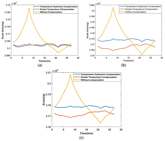 Based on the temperature hysteresis model, the scale factors of the three QFAs were compensated. One of the best results of compensated scale factor vs. time are shown in Figure 6, and the temperature sensitivity of the compensated scale factor is shown in Table 4.