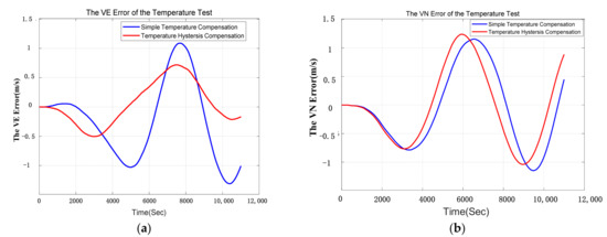 The laboratory experiments of INS are conducted for 10 times and one of the best results of the comparative experiments is shown in Figure 9 and Table 6. The blue curve indicates the navigation error compensated by simple compensation and the red curve indicates the navigation error compensated by temperature hysteresis compensation. It can be concluded that the east velocity error (VE error) and the longitude error are restrained obviously, and the north velocity error (VN error) and the latitude error are also slightly reduced.