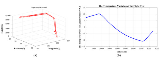 A flight test was conducted with the GNSS/INS in November 2019. The INS was installed outside the plane. The flight altitude was about 10,000 m, and the flight lasted for around 2.3 h. The GPS was used as a reference to evaluate the performance of the INS. The outputs of INS, including angular rate, acceleration, position, and velocity, are synchronized with the outputs of GPS. The flight path of the aircraft is shown in Figure 11a. There is no temperature control system for INS and the temperature of INS is measured by a temperature sensor assembled inside of IMU. The INS used in the flight experiment is composed of 3 parts: IMU, navigation computer, and power module. IMU is set in a cabin which is isolated from other parts. We used the temperature readout of IMU as the temperature of INS. IMU consists of three accelerometers and three gyroscopes which are assembled on an aluminum alloy fixture whose temperature distributes uniformly. Therefore, the temperature of INS is equivalent to the surface temperature of aluminum alloy fixture whose temperature is almost the same as the surface temperature of the accelerometer. The temperature of IMU is shown in Figure 11b. The flight phase was divided into three parts: