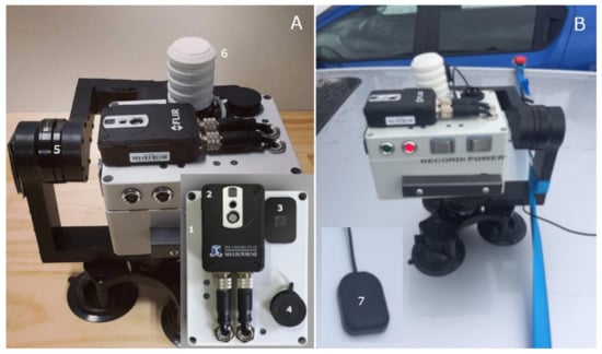 The integrated camera system (Figure 2) consisted of a visible RGB video camera and a thermal infrared camera FLIR AX8™ (FLIR Systems, Wilsonville, OR., USA) with a resolution of 90 × 60 pixels, connected to a web-based system that can simultaneously capture and store the videos and infrared thermal images (IRTIs) to be further downloaded for analysis or transmitted to cloud storage and processing system. The thermal camera had a spectral range of 7.5–13 μm, an accuracy of ±2 °C, and an emissivity of 0.985. The IRTI capture rate was every second. The RGB video camera is connected to a Raspberry Pi Camera Module V2.1 (Raspberry Pi Foundation, Cambridge, UK; Figure 2A), board, and memory card. This device has an 8-megapixel sensor with a resolution of 640 × 360 pixels, 4:3 aspect ratio, and 30 frames per second (fps). Videos were recorded within the unit in H.264 video compression format and automatically converted into Motion Pictures Expert Group-4 (.mp4) files. The camera was fitted with a 3-axis gimbal to minimize movements when acquiring the data (Figure 2A); an integrated temperature, relative humidity, and solar radiation sensors within a 3D printed Stevenson screen (Figure 2A); and a magnetic GPS tracker (Figure 2B). The integrated camera was mounted on top of a car (Figure 2B) with a height between the camera and the tree canopies of approximately 5 m.