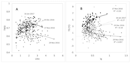 Figure 6A compares growth parameters (LAIe) for the 172 trees monitored with the TWSI for the different measurement dates. The trends followed apparent curvilinear relationships with the last two dates (19 December 2016 and 16 January 2017) with lower LAIe and higher TWSI than the earliest dates (17 November 2016 and 29 November 2016). Figure 6B shows the comparison between the Ig and TD parameters related to stomatal conductance from trees. There was contrasting behavior of these parameters for the first two dates with lower Ig and higher TD for the first and flat distribution of the whole range of Ig values with low TD close to the 0 values. On the contrary, the last two dates had similar behavior with low Ig and TD values ranging from −3 to around 3 °C.