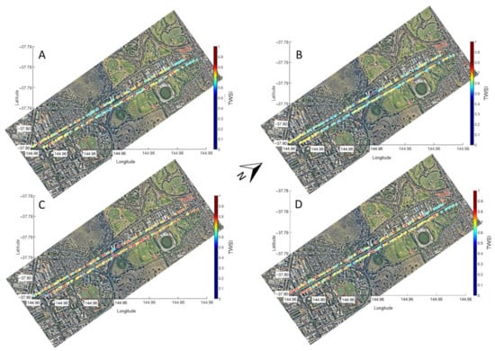 Mapping of tree water stress index (TWSI) along the Royal Parade (5.04 Km) of 172 trees using the proposed urban tree monitoring system for four different dates: (A) 17 November 2016, (B) 29 November 2016, (C) 19 December 2016, and (D) 16 January 2017. Different colors correspond to the TWSI scale.