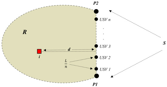 where is supposed to be constant and represents the standard Euclidean vector norm. Also, let be the planar coordinates of the intruder I at time t. Moreover, let n be an integer that satisfies and denotes the number of autonomous USVs in the multi-USV team.