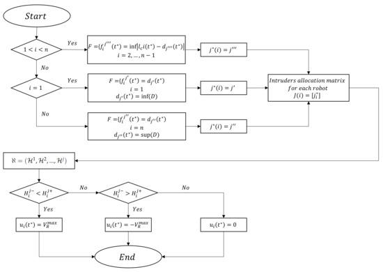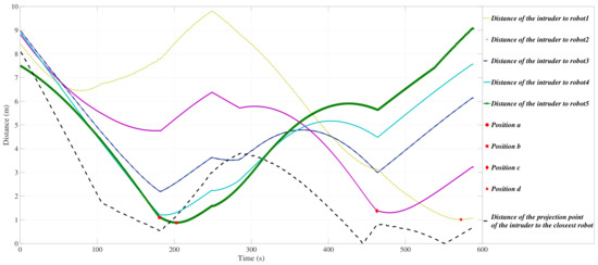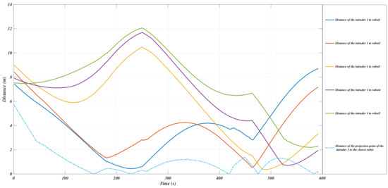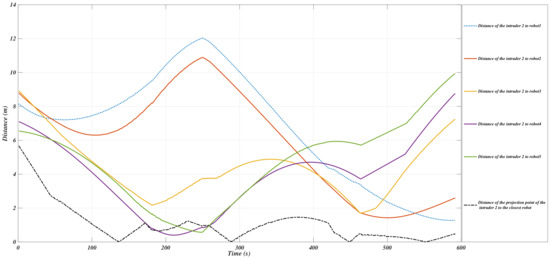 where represents the distance between intruder i and point and denotes the distance between USV i and point . Furthermore, D and Q represent sets of distances between the intruders and the robots to the point , respectively.
