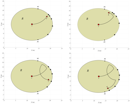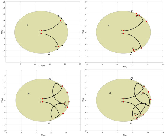 Based on the requirement (2), none of the team members are allowed to change the formation order of the team on . Equation (3) describes the way the USVs move along segment on the boundary.