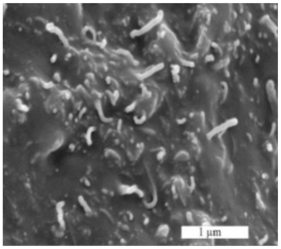 To make a particulate-filled composite, EOC (20 wt%) was first dissolved in toluene of temperature 70 °C and mixed at 400 rpm for 24 h. Then, the MWCNTs were dispersed in EOC solution by a sonication using the UZ Sonopuls HD 2070 (Helago-CZ s.r.o., Hradec Kralove, Czech Republic) for 15 min at room temperature. Subsequently, the EOC solution and the appropriate MWCNT dispersion were combined and stirred at 120 rpm for two hours (shaft mixer IKA RW 1 Merck, Kenilworth, NJ, USA). The final concentration of MWCNTs in the MWCNT/EOC dispersion, which was used for the coating of the electrodes, was 36 wt%, which was well above the percolation threshold. The measured electrical conductivity of the MWCNT/EOC composites was 0.35 S/m. The cross-section structure of the MWCNT/EOC composite was analyzed by the scanning electron microscope (SEM) (NOVA NanoSEM 450, FEI Co., Lincoln, NE, USA). The corresponding micrograph is shown in Figure 1.