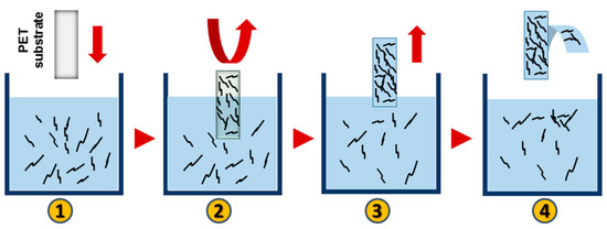 Stages of forming of the electrically conductive layer on the PET substrate by dip-coating: (1) immersion of the PET substrate in the MWCNT/EOC dispersion, (2) incubation for 10 s, (3) withdrawal (wet layer formation), (4) draining, solvent evaporation for 24 h, and peeling off of the tape with the composite layer from one side of the PET substrate.