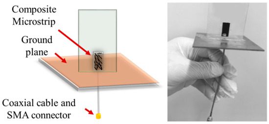 The microstrip was made of the PET substrate (Fatra a.s, Napajedla, Czech Republic) coated with the MWCNT/EOC composite. The size of the 0.18 mm thick microstrip was 10 × 20 mm and its weight 0.402 g. The electrically conductive layer of the MWCNT/EOC composite was deposited on the PET substrate by a dip coating. Pristine nanotubes were dispersed in toluene and sonicated using the UZ Sonopuls HD 2070 at 50% power and 50% pulse mode at room temperature for 15 min. Then, MWCNT dispersion was mixed with the solution of EOC to prepare the coating dispersion containing 36 wt% nanotubes. Before the coating, one side of the PET foil was covered with an adhesive tape. Then, the PET substrate was immersed in the coating solution for 10 s and subsequently, left to dry at room temperature for 24 h (Figure 3). In the end, the tape was peeled off from the two-layered structure consisting of the PET substrate. The resulting unilateral composite coating of the microstrip was about 480 μm thick. The PET substrate side of the microstrip was attached to a dielectric poly (methyl methacrylate) plate (Polycasa, s.r.o., Pribram, Czech Republic) of 60 × 70 mm and thickness of 1.5 mm (Figure 4). The ground plane of the sensor was made from a Flame Retardant 4 (FR-4) epoxy substrate covered with copper (105 × 105 mm) with dielectric constant εr = 4.4. The thickness of the substrate was kept at 1.6 mm.