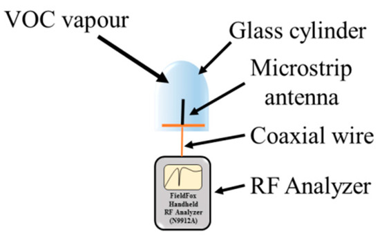 To assess the VOC-dependent alteration of the sensor reflection coefficient, the sensor with the composite microstrip was placed into a chamber filled with a saturated vapor of the respective VOC liquid, the layer of which was at the bottom (Figure 5). After exposure to the given vapor for the predetermined time, the power reflected from the sensor was assessed in the range from 2 MHz to 4 GHz by the N9912A FieldFox Handheld RF spectrum analyzer (Keysight Technologies, Santa Rosa, CA, USA) and quantified by the sensor reflection coefficient S11. Subsequently, the sensor was removed from the chamber and the reflection coefficient was assessed after desorption time.