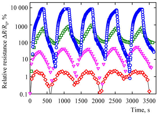 The time-dependent relative resistance of the MWCNT/EOC composite sensor in the presence of saturated vapors of heptane (blue circles), toluene (dark green squares), acetone (pink triangles), and ethanol (red diamonds) in the course of five consecutive adsorption/desorption cycles.