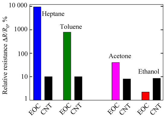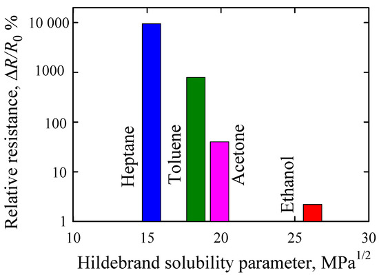 The mechanism underlying the increase in resistance of the MWCNT/polymer composite in the presence of VOCs has been explained as a consequence of an adsorption of the VOCs on the MWCNT surface and of a marked expansion of the volume of the composites [1,2,3,4,12,13]. A swelling of the underlying matrix results in the formation of non-conducting layers between the embedded nanotubes, which separates the nanotubes and thus, decreases the number of conductive inter-tube contacts [17,18]. The extent of the swelling depends on the correspondence between the Hildebrand solubility parameter of the polymer and the permeating solvent [40]. For example, when the Hildebrand solubility parameters δ = 15.5 MPa1/2 for a polymer polydimethylsiloxane (PDMS) and a solvent are similar, the maximal expansion of the polymer ensues [40]. However, when the polarity and solubility of the solvent are greater than those of PDMS, the swelling of the polymer is progressively reduced [40]. By analogy, exposure of the MWCNT/EOC composite with δ of EOC of 16.4 MPa1/2 [41] to heptane with a similar δ of 15.3 MPa1/2 increased the relative resistance of the composite by almost 10,000% (Figure 7). However, penetrating vapors with higher δ such as toluene (δ = 18.3 MPa1/2) and acetone (δ = 19.9 MPa1/2) increased the relative resistance of the MWCNT/EOC composite to a lower extent by about 800% and 20%, respectively (Figure 7). Ethanol with δ = 26.2 MPa1/2 did not substantially alter the relative resistance of the MWCNT/EOC composite (Figure 7).