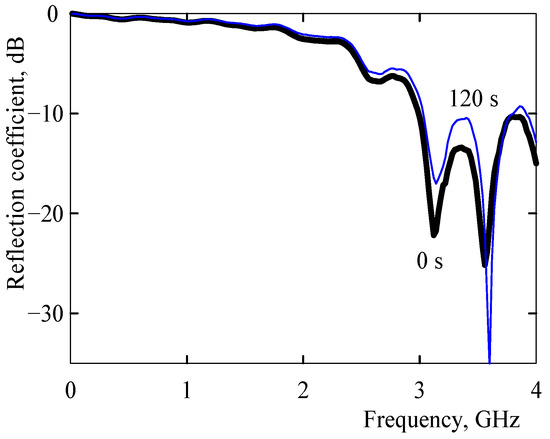 In the initial state prior to vapor exposure, there were two distinct reductions in the reflection coefficient at frequencies of about 3.1 and 3.6 GHz markedly, which were separated by a peak at about 3.35 GHz (Figure 9 and Figure 10). Upon exposure to heptane, the reflection coefficient substantially increased at about 3.1 and 3.3 GHz and markedly decreased at 3.6 GHz (Figure 9 and Figure 10). There were no differences in spectra at higher frequencies up to 18 GHz.