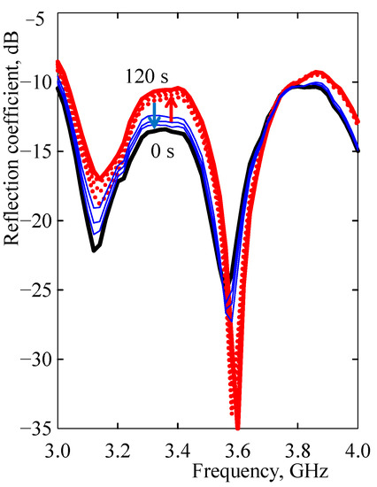 The dual resonant frequency mode was achieved using a microstrip with dispersed MWCNTs built into a traditional microstrip resonator, which is characterized by a single resonant frequency. Attainment of dual resonant frequency mode by incorporating the MWCNT/EOC composite was a novel promising modification of the microstrip system. The impedance of a microstrip was variable not only by the frequency of electromagnetic waves, but also by changes in its size due to exposure to vapors. For example, the average expansion of the non-polar PDMS layer (δ = 15.5 MPa1/2) by heptane (δ = 15.3 MPa1/2) is 169% [40]. The volume expansion of a similar non-polar EOC (δ = 16.4 MPa1/2) by heptane may very likely be comparable to the expansion of PDMS. The difference is that the MWCNT/EOC microstrip was attached to the PET substrate and expanded freely only in the thickness direction. The vapor-induced effect of microstrip thickness increased the resolution of the dual resonant mode. Non-polar heptane increased the value of the reflection coefficient at a frequency of electromagnetic waves of 3.1 GHz and decreased it at a frequency of 3.6 GHz (Figure 9 and Figure 10). The longer the heptane penetrated into the microstrip, the greater the difference in the values of the reflection coefficients in the resonant frequencies (Figure 10). The shift of a reflection coefficient spectrum advanced fast and after about 30 s, the spectrum was nearly the same as the final steady one after 120 s. The red arrow indicates an increase in exposure time and a shift of the spectrum of the reflection coefficient from the initial one at 0 s to the final time at 120 s. The blue arrows indicate an increase in desorption time and a shift of the spectrum of the reflection coefficient from the initial one denoted with a red thick line to the final spectrum denoted with a dark blue thick line after 120 s.