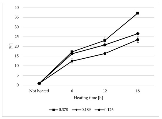 The change in the surface-to-volume ratio of the heated oil also led to changes in the composition of fatty acids in the samples (Table 1). Saturated and monounsaturated fatty acids (MUFA) were observed to increase their contribution to all fatty acids. There was a decrease in the level of polyunsaturated fatty acids (PUFAs) in the pool of fatty acids and in the iodine value expressing the oil unsaturation degree. As before, PUFAs were degraded at highest rate when thin layers of oils were heated (0.378 s/v ratio). The increase in the volume of the heated oil (decrease in the surface-to-volume ratio) led to slower degradation of fatty acids. The decrease in the PUFA content was 7.59, 4.66, and 3.15% in heated oil with the 0.378, 0.189, and 0.126 s/v ratios, respectively. The decrease in the amount of polyunsaturated fatty acids was associated with their greater susceptibility to oxidation processes than monounsaturated fatty acids [32].