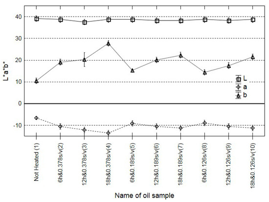 Similar conclusions can be formulated based on the analysis of changes in the colour. There were no significant differences correlated with the duration of heating, with the ratio of the surface area of oil in contact with oxygen and oil volume, and with the change in the content of polar compounds (Figure 2). Similar results were obtained in previous analyses of cold-pressed rapeseed oil with different quality expressed by the acid value [17]. The present results support the thesis that oil colour may not be an adequate marker of oil quality.