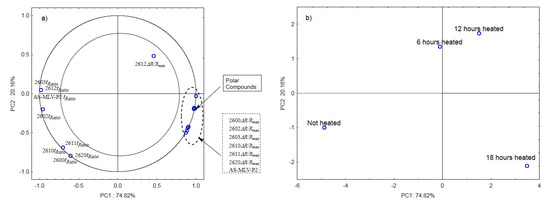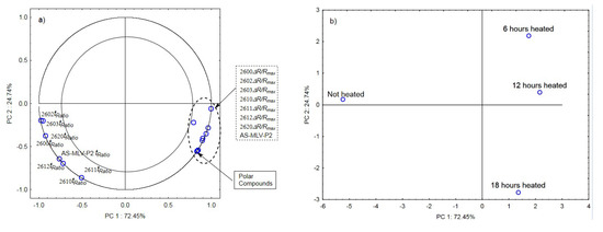 Figure 5a,b show the results of the principal component analysis for oils with the 0.126 s/v ratio. Figure 5a is a projection of loadings on the PC1 and PC2 planes, which shows a significant positive correlation between the maximum sensor responses and changes in the content of polar compounds as a function of the frying time and a negative correlation with the time ratio. In this case, the projection of loadings on the PC1 and PC2 planes differentiates the heated samples from the control sample (PC1) and the heating time (PC2) (see Figure 5b).