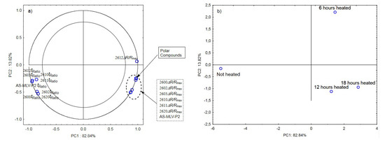 (a)—Plot of two principal component loadings (PC1, PC2) from eight sensor readings and polar compounds obtained for heated (0.189 s/v ratio) and control oil samples (ΔR/Rmax, tRatio; AS brief names of sensors—AS-MLV-P2; 2600, 2602, 2603, 2610, 2611, 2612, 2620—brief names of sensors Figaro—TGS series); (b)—Plot of two principal component scores (PC1, PC2) from eight sensor readings and polar compounds obtained for heated (0.189 s/v) and control oil samples.