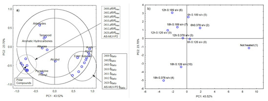 (a)—Plot of two principal component loadings (PC1, PC2) from eight sensor readings and polar compounds obtained for heated (0.126 s/v ratio) and control oil samples (ΔR/Rmax, tRatio; AS brief names of sensors—AS-MLV-P2; 2600, 2602, 2603, 2610, 2611, 2612, 2620—brief names of sensors Figaro—TGS series); (b)—Plot of two principal component scores (PC1, PC2) from eight sensor readings and polar compounds obtained for heated (0.126 s/v) and control oil samples.