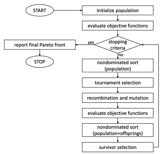 - Deb, K.; Pratap, A.; Agarwal, S.; Meyarivan, T. A fast and elitist multiobjective genetic algorithm: NSGA-II. IEEE Trans. Evol. Comput. 2002, 6, 182–197. [Google Scholar] [CrossRef]