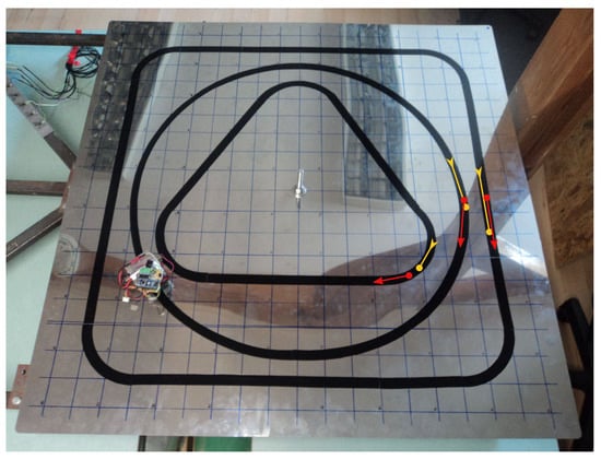 The laboratory test stand: a 1 m × 1 m × 0.5 mm steel plate with a line-follower robot and three test trajectories. The beginning and the end points of each trajectory are marked with red and yellow arrows, respectively. The square and circle trajectories were covered twice, while the triangle trajectory was covered three times.