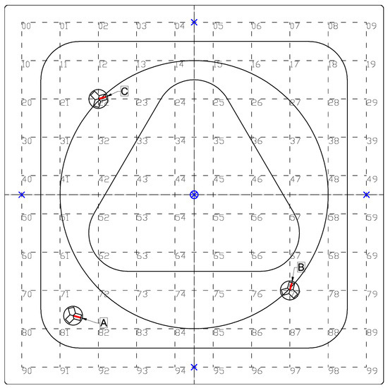 The proposed approach was verified using a laboratory testing stand shown in Figure 2. It consisted of a steel plate, 1 m × 1 m × 0.5 mm in dimensions, pointwise supported in the middle and near the edges, and a line-follower robot with a track width of 28 mm. The moving load was applied in the form of the weight of the robot. Its mass was 0.302 kg, and it used a set of optical sensors to follow one of the three test trajectories shown in the photo (a square, a circle and a triangle) with a constant velocity of about 9 cm/s. The plate was instrumented with three strain gauges, which were denoted A, B, and C, and placed as shown in Figure 3. They were fixed at the bottom face of the plate to avoid collision with the robot and damage.
