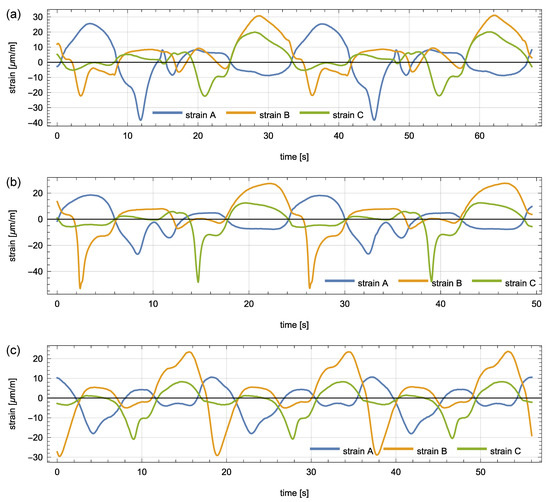 Recorded responses of the three involved strain sensors to the moving load (line-follower robot) following the test trajectories: (a) the square trajectory, (b) the circular trajectory, and (c) the triangle trajectory.