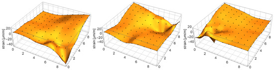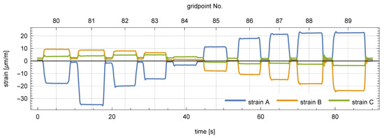- The constant gravity load of a 0.265 kg mass was applied successively in all 100 points of the grid, and the responses of the sensors were recorded. A fragment of the measurement signal (load in points No. 80 to 89) is shown in Figure 5. A limited degree of nonlinearity can be observed in the responses of the sensors: a small drift of the readings in the unloaded state (bias drift) and a small relaxation-like behavior, which can be probably linked to the sensor–plate adhesive layer. Such effects increase the measurement error, and although they are undesirable in applications, they helped here to test the robustness of the proposed method.